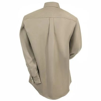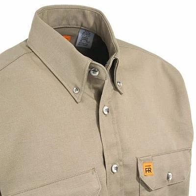This khaki men’s top is crafted from the finest quality flame-resistant 6.5-ounce 100% cotton FR twill fabric and meets NFPA 2112 requirements and NFPA 70E, ASTM 1506 and OSHA Rule 1910.269 standards. It’s rated HRC2, ATPV 8.5 CAL/CM2.