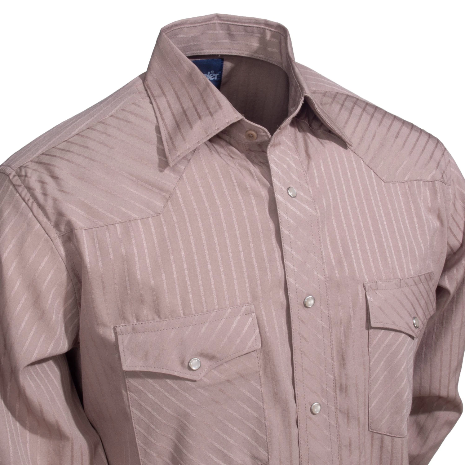 For practical style that goes from work to casual wear with a subtle stripe in solid tan, order this Wrangler Men’s Tan 75742 TN Sport Western Dobby Stripe Long Sleeve Shirt from Working Person’s Store today!